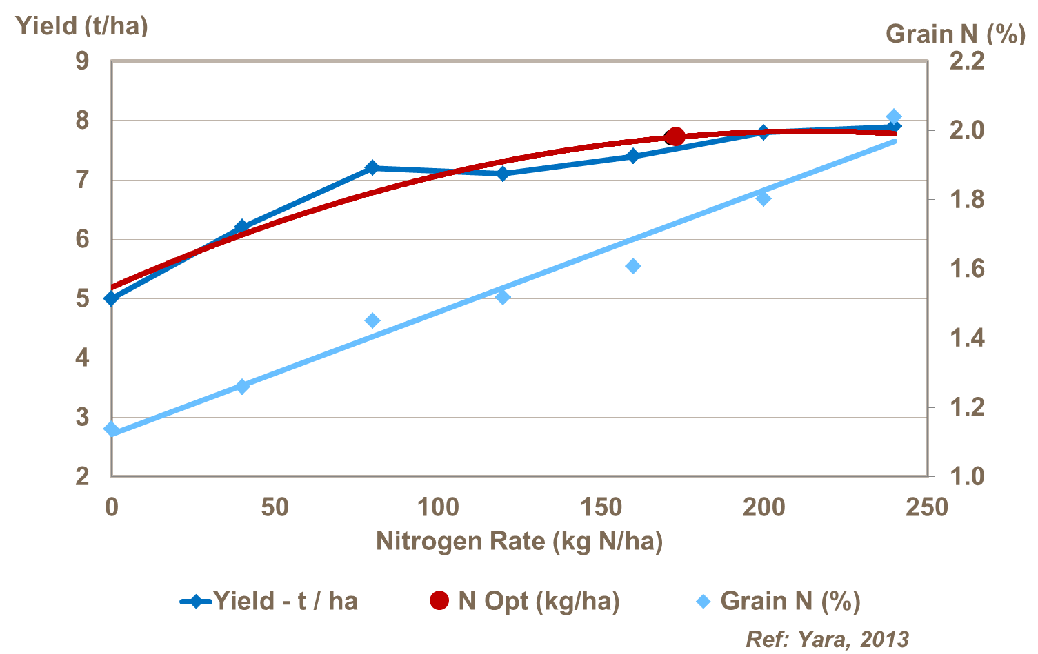 Des taux plus élevés d’application directe augmentent l’azote/protéines dans les grains d’orge. Cela peut être souhaitable lorsque la récolte est utilisée pour nourrir les animaux. Toutefois, lorsque le marché est pour l’orge malté faible en azote, des taux réduits seront nécessaires. Il est donc important de faire correspondre le taux d’azote avec les objectifs de rendement et de qualité souhaités. Pendant la phase de remplissage des grains, l’azote est redistribué des tiges, des feuilles et de la balle au grain en développement. Le système radiculaire restera actif pendant cette phase, ce qui pourrait entraîner une forte absorption d’azote dans le sol, entraînant tardivement une forte teneur en protéines des grains.